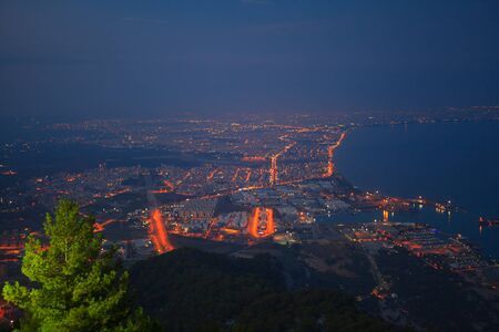 View from the mountains on Alanya, Turkey. Cityscape with sunset over the sea.