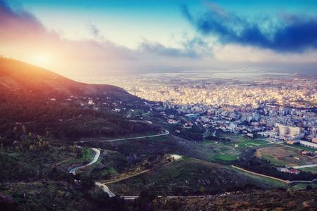 View from the mountains on Alanya, Turkey. Cityscape with sunset over the sea. Tilt-shift effect.