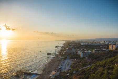 Panorama of resort town on Mediterranean coast. Panoramic aerial view of seaside resort. Antalya, Turkey.
