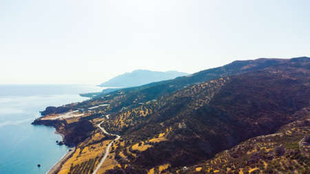 Aerial Nature Greek Landscape with Sea or Ocean Bay and Empty Sand Beach. Beautiful Vacation and Tourism Destination in Crete, Greece.