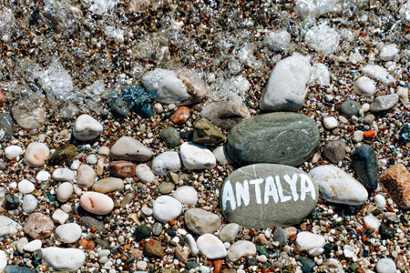 stones on the beach with a blue sea and the inscription Antalya