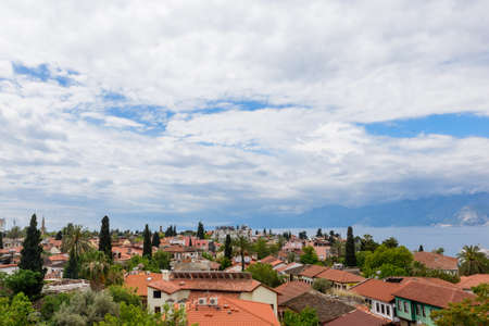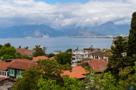 ANTALYA, TURKEY: Beautiful top view of the old town, the sea and the mountains on a sunny summer day in Antalya, Turkey.