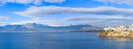 Panoramic view of Antalya Old Town port, Taurus mountains and Mediterranean Sea, Turkey - May 2023. High quality photo
