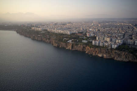 Aerial view of the Mediterranean Sea and the coast of Antalya and the city itself from the sea, Turkey