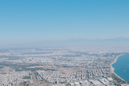 Beautiful bird view at Antalya city in Turkey and amazing blue sky and sea water. Horizontal color photography.