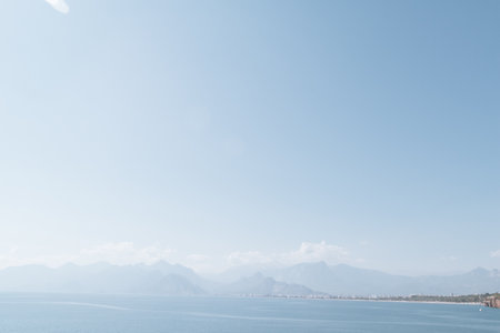 Antalya Mediterranean Sea harbor view with distant smoky mountains. Tourism and travel destination photo in Karaalioglu Park, Antalya, Turkey.