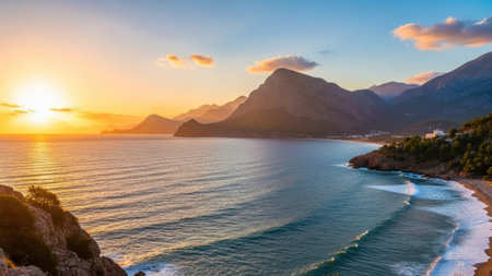 A serene and tranquil coastal scene showcasing the beautiful sandy beach and majestic mountains of Antalya