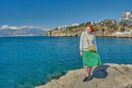 Turkish tourist city and resort Antalya in spring in March, young woman stands on coast of Mediterranean Sea.