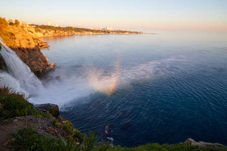 Waterfall with water falling in sea in the evening time with sunset. Waterfall Duden at Antalya in Turkey. Concept of nature travel