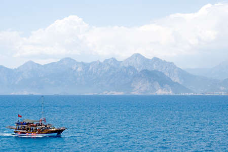 ANTALYA, TURKEY - JULY 20, 2015 : View of sailing boat in blue sea of Antalya, with high mountains around, on blue bright sky background.