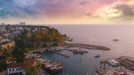Aerial view of Antalya Kaleici old town yacht harbor and coastal town in sunlight
