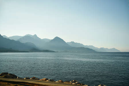 Mountains and sea view in the sunset haze for meditation and travel concept. Sea view on coast and Taurus Mountains near Kemer, Turkey.