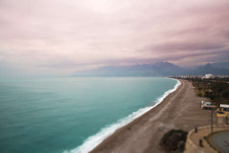 Sea coast tilt-shift effect, Mediterranean coast of Turkey, Antalya embankment on a cloudy day