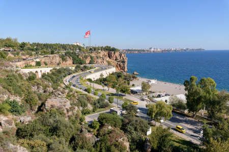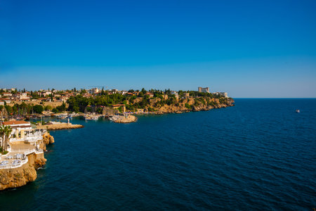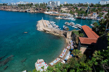 Mediterranean sea, and the coast of Antalya. Old town Kaleici, Yacht Marina. Small beach from top and panoramic shot of the rocks and buildings