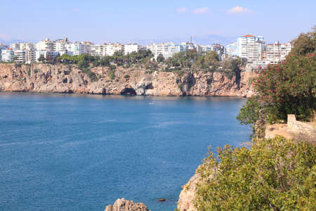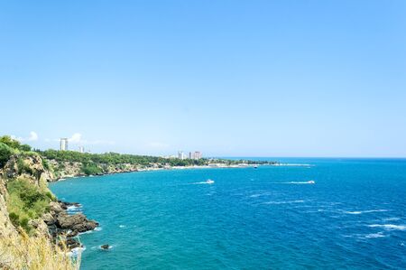 Sea coast of Antalya. Sea shore. Turkish resort. Urban buildings on a rocky beach.