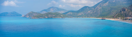 Aerial view of Oludeniz beach with people and boats in the morning, Coastline next to Fethiye, Turkey. High quality photo