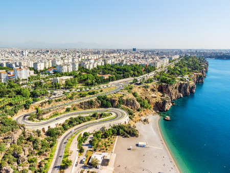Awesome view of scenic winding road to Konyaalti Beach in Antalya, Turkey. Drone flying over the road. Konyaalti Beach is a popular tourist attraction in Turkey.