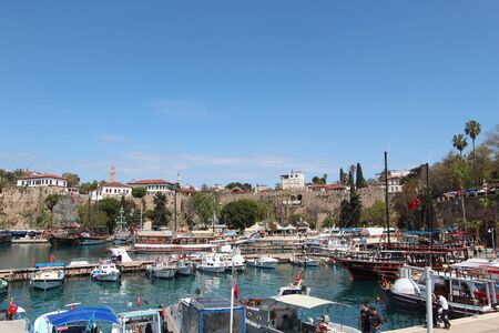 Antalya, Turkey - May 19, 2019: The old port of Antalya, excursion yachts in the port of Kaleici.