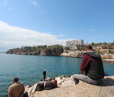 Tourist port in Turkey. View of the Mediterranean Sea with ships and yachts. People are sitting along the shore on the rocks.