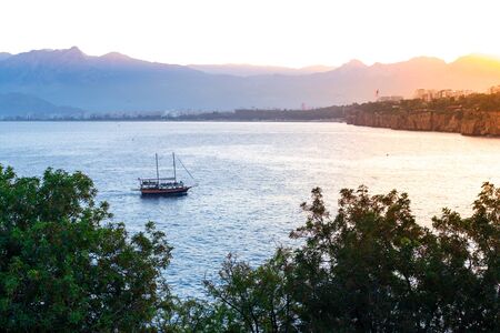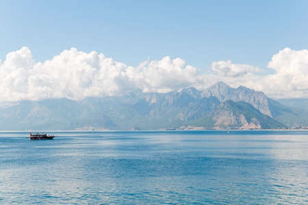 ANTALYA, TURKEY - JULY 20, 2015 : View of sailing boat in blue sea of Antalya, with high mountains around, on blue bright sky background.