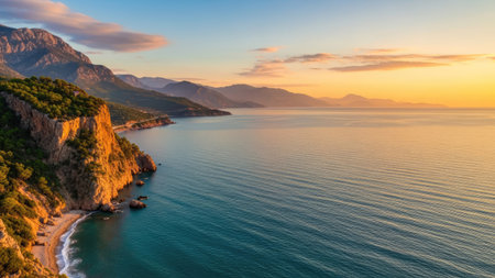 Aerial view of the sea and mountains at sunset in Montenegro.