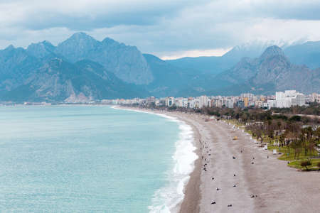 Scenic view of famous turkish Konyaalti Beach in the overcast weather, clouds cover the mountains. Antalya, Turkey