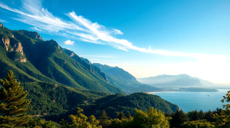 The sea distance against the background of mountains on the horizon. The beauty of the environment.