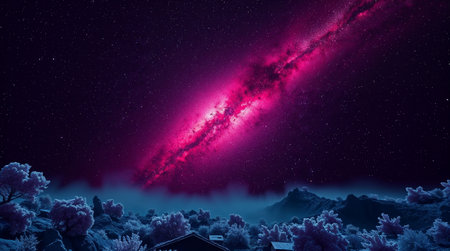 Bright pink milky way illuminating a serene, starry landscape. Ai generated image