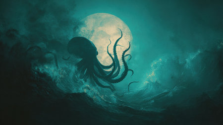 Tentacle silhouette rises in dark waves under a bright moon, creating a mystical and eerie atmosphere at night by the ocean.