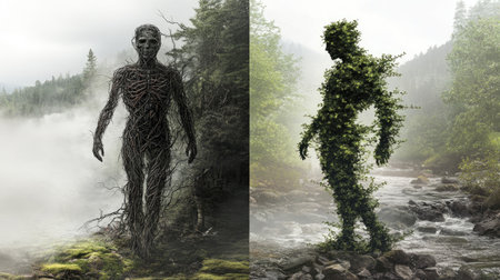 cg monster with intricate underwater world tattooed on its body, captured in a sepia-toned photo. the realistic landscape surrounding the monster is depicted with soft, tonal colors, creating a mesmerizing scene. the photo, taken with a zeiss batis 18mm f2.8 lens, showcases the tangled nests and the matte finish adds a touch of mystery. the overall effect gives a pseudo-infrared feel to the image. ai