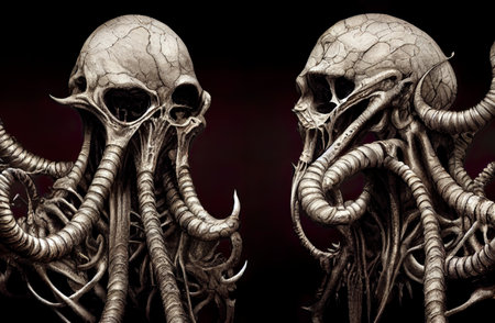 creature horror wallpaper with a lovecraftian twist, inspired by the hyperrealistic fauna of alejandro burdisio. the rusted debris and depth of field add to the eerie atmosphere, reminiscent of the works of georges lacombe. xbox 360 graphics bring this terrifying scene to life. keywords: creature horror, wallpaper, lovecraftian, hyperrealistic fauna, rusty debris, depth of field, georges lacombe, xbox 360 graphics. ai generated