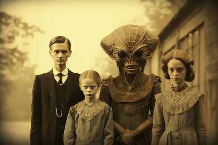 Family and alien humanoid, sepia style vintage retro photo