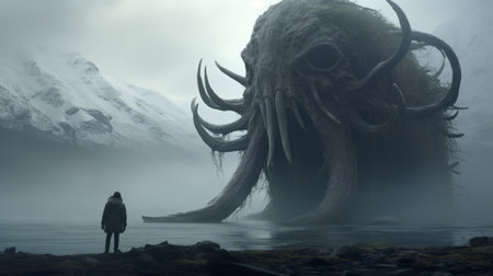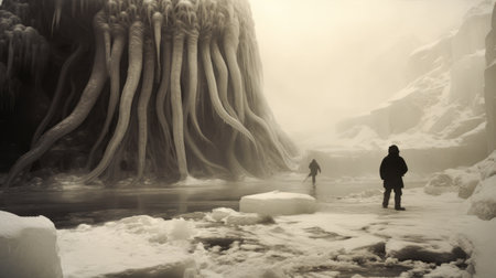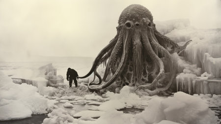 a man stands on an ice field, holding a massive octopus. this surreal image captures the essence of ominous landscapes, reminiscent of retro sci-fi scenes. influenced by science fiction, the photo showcases the artistic style of alex howitt and the highly detailed environments reminiscent of ivan shishkin's work. shot with a dallmeyer 3b 75mm f19 super six anastigmat lens, this photo is a captivating blend