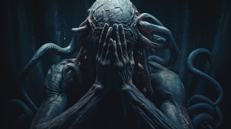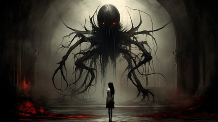 An AI generated illustration of a demonic figure with tentacles and red eyes in the dark