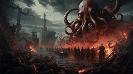 a photo featuring a large octopus and numerous other monstrous creatures aboard a boat. the image showcases a dystopian cityscape style with photorealistic renderings, predominantly in dark red and black tones. the photo incorporates elements of dd, cartelcore, religious symbolism, and heistcore aesthetics. ai generated