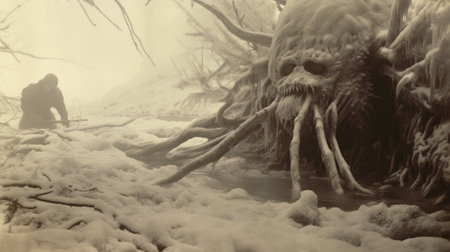 unseen monster walking beside a wintery path, depicted in a realistic and hyper-detailed style reminiscent of war photography. the creature, composed of insects, evokes a lovecraftian aesthetic. captured using the angenieux 45-90mm f/2.8 lens, this large-scale image could be a scene from an animated film, paying homage to the pioneers of the genre. ai generated