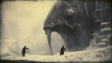 two men walking in front of an enormous walrus, captured in a mesmerizing experimental cinematography style. this lovecraftian scene features a stunning matte painting backdrop, showcasing the influence of mono-ha art movement. the high resolution image beautifully captures the snowy surroundings, leaving viewers in awe of its breathtaking beauty. ai generated