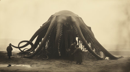 a squid and a human being standing on the beach, creating an otherworldly grotesque scene. the sepia tone adds to the eerie atmosphere, while oversized objects and misty gothic elements enhance the 1918-1939 interwar movie still vibe. this national geographic photo captures a captivating moment of surrealism and curiosity. ai generated