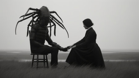 a woman gripping a colossal insect stands beside a man seated on a rustic wooden bench. this enigmatic image combines elements of southern gothic-inspired art, minimalist representations, medical imaging film, primitive figurines, mysterious seascapes, and stark black-and-white photography. the primitivist style adds an intriguing touch to this captivating composition. ai generated
