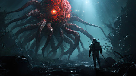 An epic underwater encounter as a lone figure faces a colossal, glowing-eyed kraken in the dark ocean abyss, sparking awe and adventure.