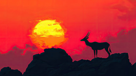 A stunning image featuring the silhouette of an antelope standing on rocky terrain against a breathtaking sunset. The vibrant orange and red hues of the sky create a dramatic backdrop, evoking feelings of peace and serenity. Perfect for nature and wildlife enthusiasts.