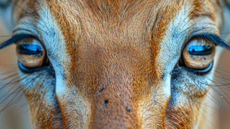 close-up view of an antelopes eyes, revealing intricate details of fur, eyelashes, and the depth of its gaze.
