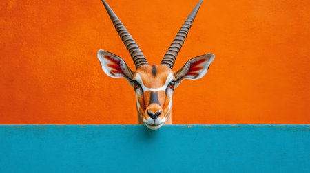Gazelle peeking over teal wall against vibrant orange background, minimalist wildlife photography. Colorful wildlife art concept