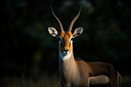 A stunning waterbuck stands alert against a dark background showcasing its unique features and expressive eyes during daylight.