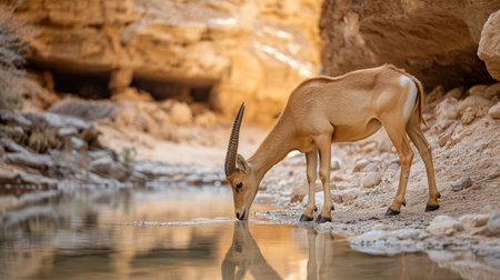 A Nubian ibex drinking from a rare desert oasis in Eritrea, surrounded by rocky cliffs and sparse vegetation.