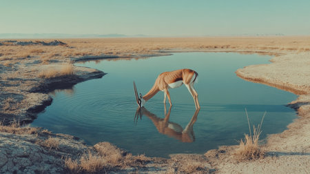 A springbok gracefully bends down to drink from a clear waterhole in Etosha National Park, surrounded by the vast, dry landscape of Namibia.