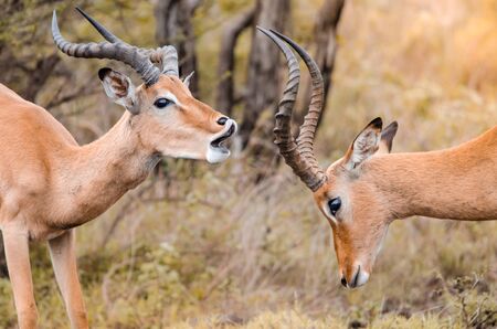 A pair of male impala (aepyceros melampus) playfully fighting one another in the Kruger national park, South Africa.