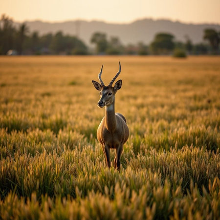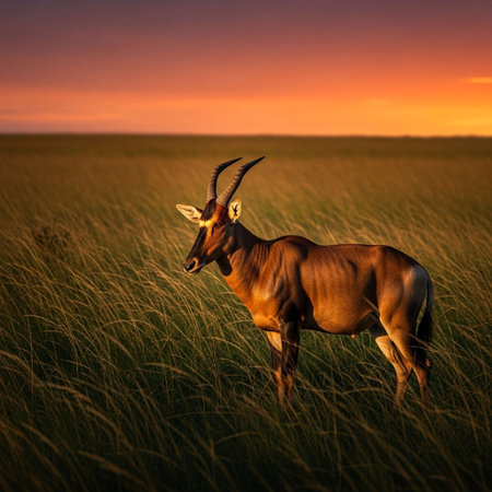 A lone antelope stands alert in the twilight of the grasslands