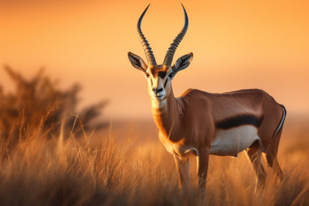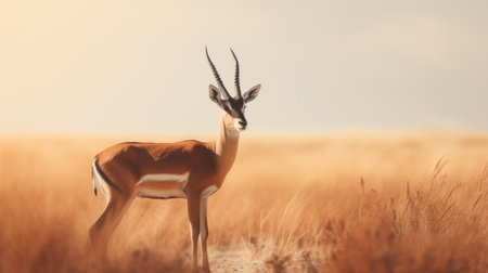 timeless gazelle photographed in a leaping pose in a grassy expanse, in a classic wildlife photography style, with sunlit tones, golden hour light, high resolution