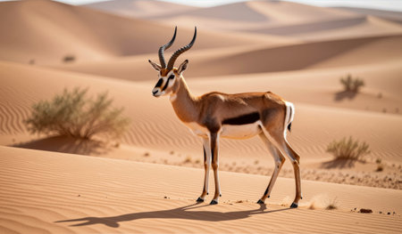 A graceful gazelle stands in the vast undulating sand dunes, its elegant form silhouetted against the brilliant blue sky. The sun casts soft shadows in this tranquil desert scene.
